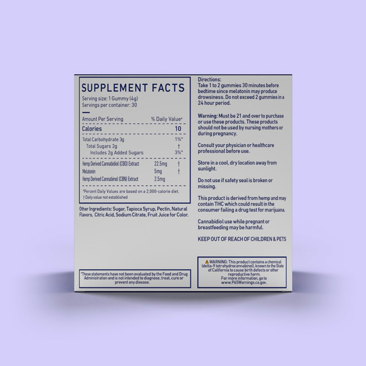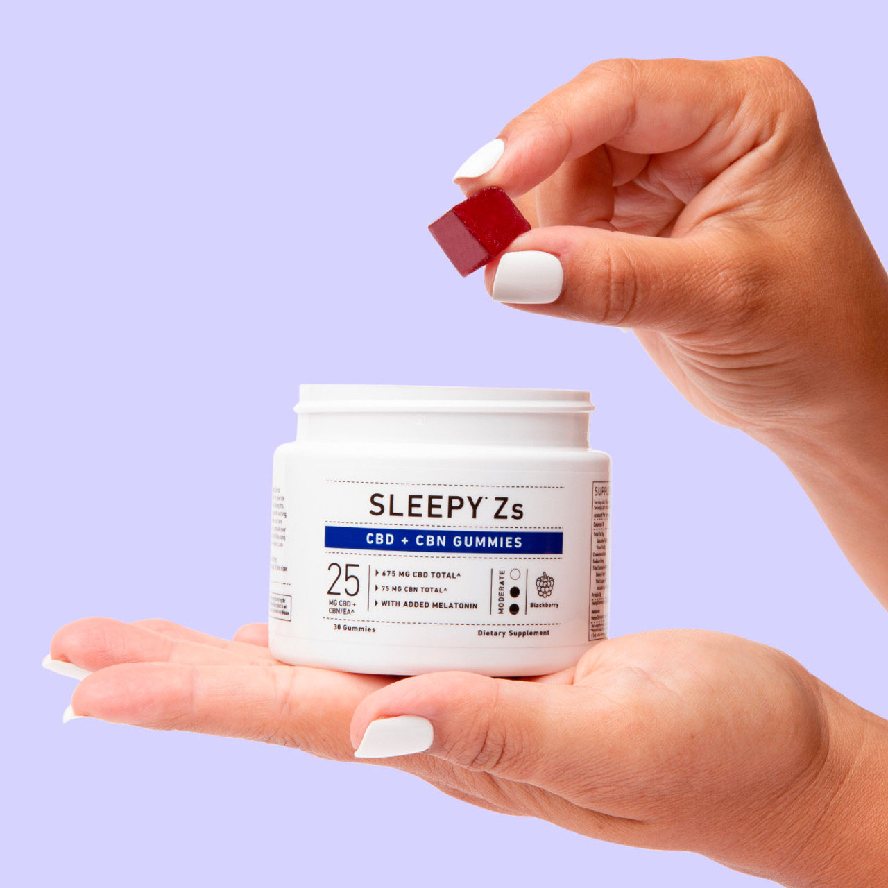 Es enthält 5 mg Melatonin und 25 mg CBD/CBN pro Gummibärchen.