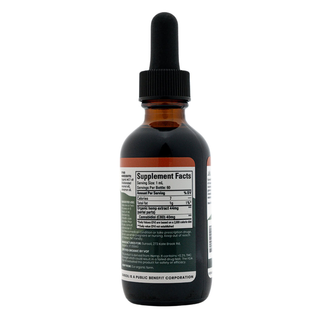 Diese Tropfen enthalten nur drei Zutaten: Hanf, MCT-Öl (aus Kokosnussöl gewonnen) und Zimtöl.